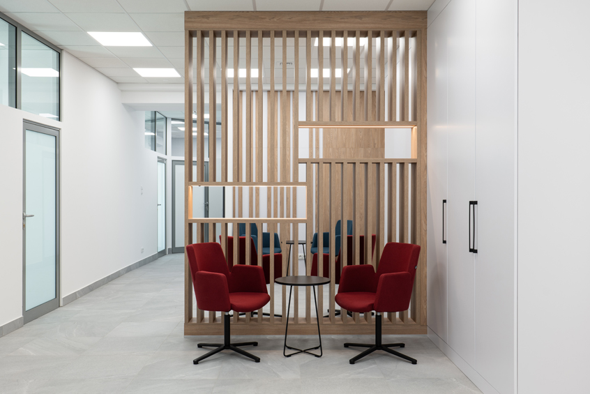 Projekt dla Naczelnej Izby Lekarskiej, to miał być projekt zwykłych biur, ale w programie funkcjonalnym była też sala rozpraw, która nadała ton całej realizacji. I – jak to wśród lekarzy – nawet tu pojawiła się „poczekalnia”. To była ta szczególna część projektu, bo jak ze zwykłego korytarza z krzesłami zrobić przestrzeń przyjemną i nieco intymną, przecież tu właśnie spotykają się zwaśnione strony w oczekiwaniu na rozprawę…