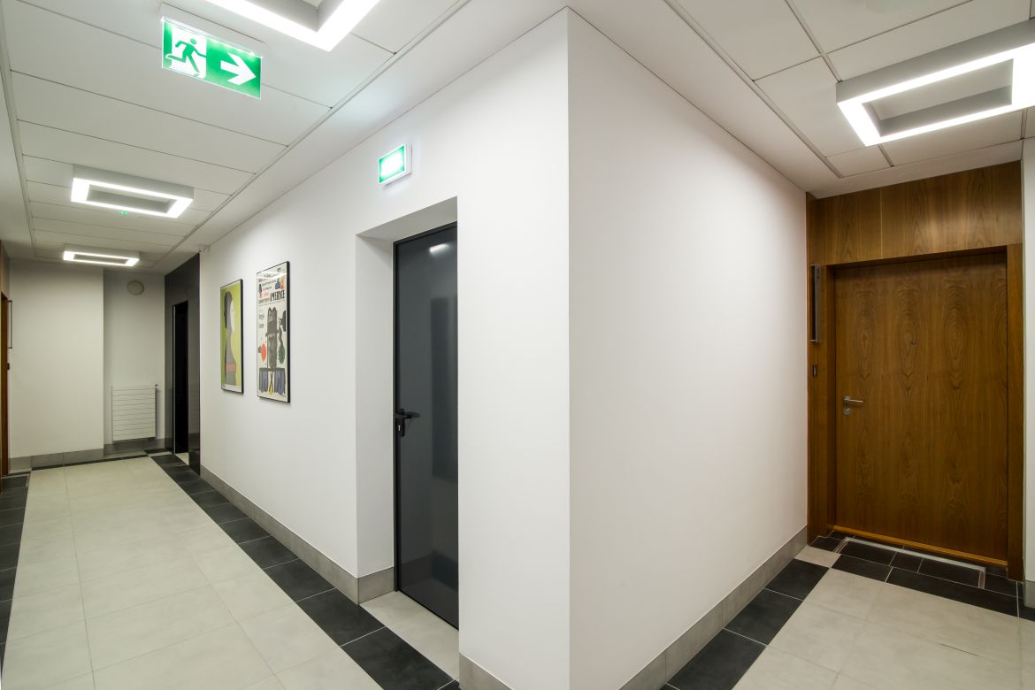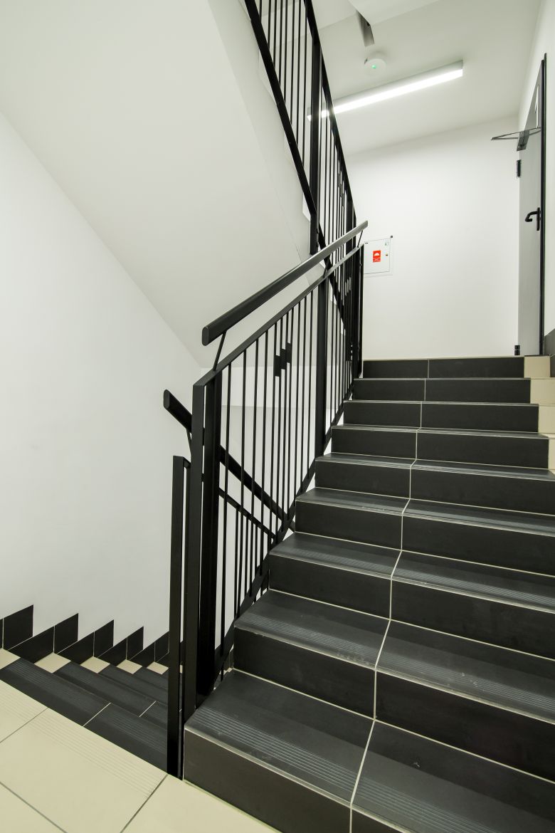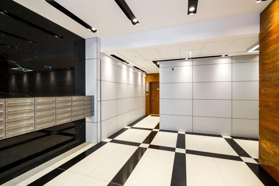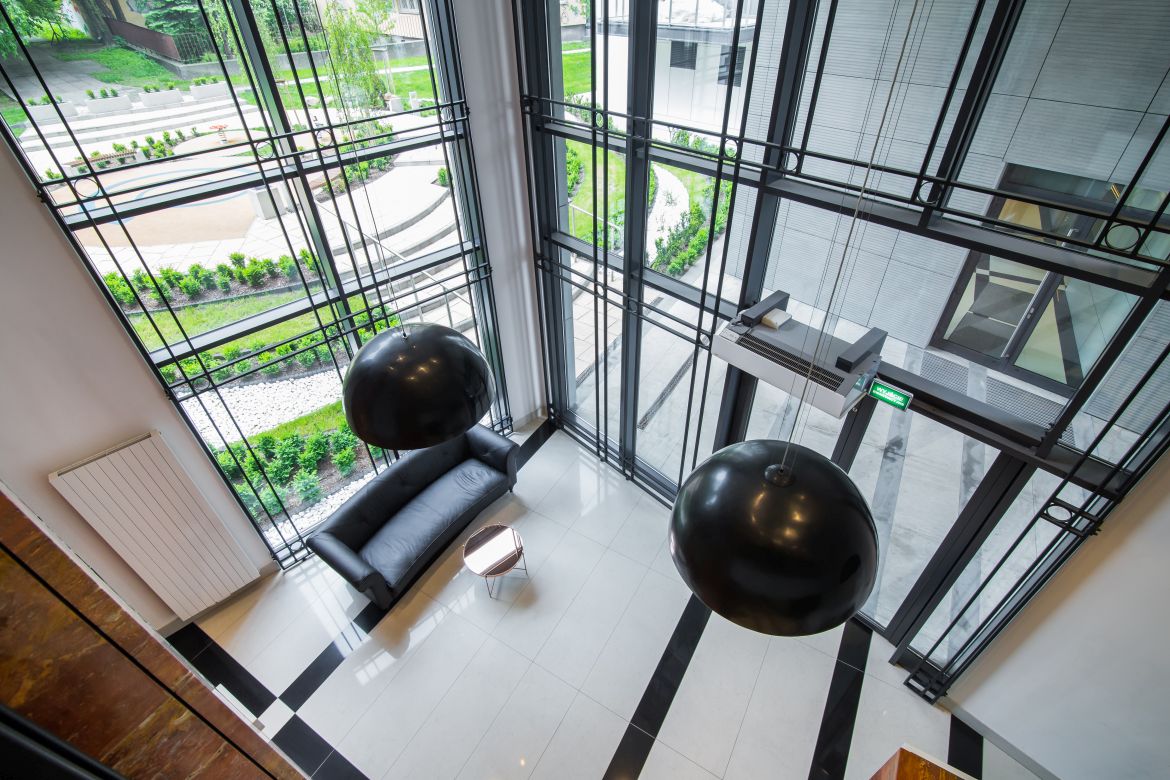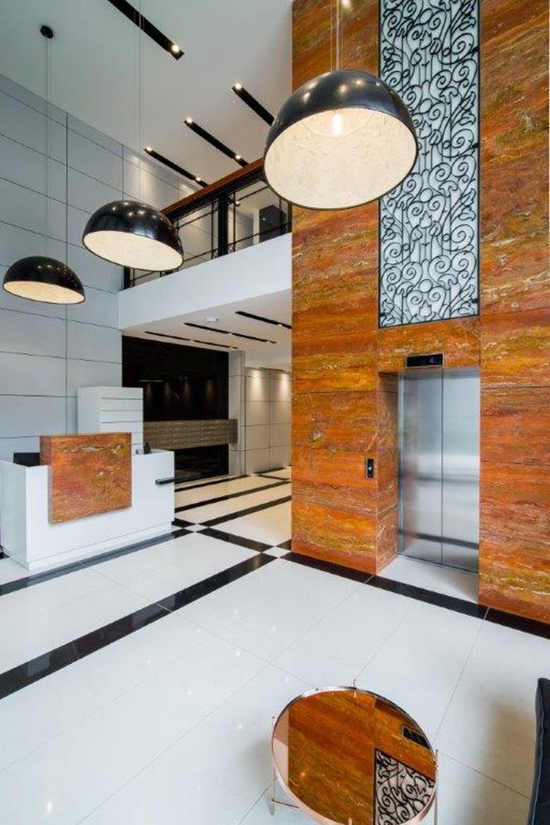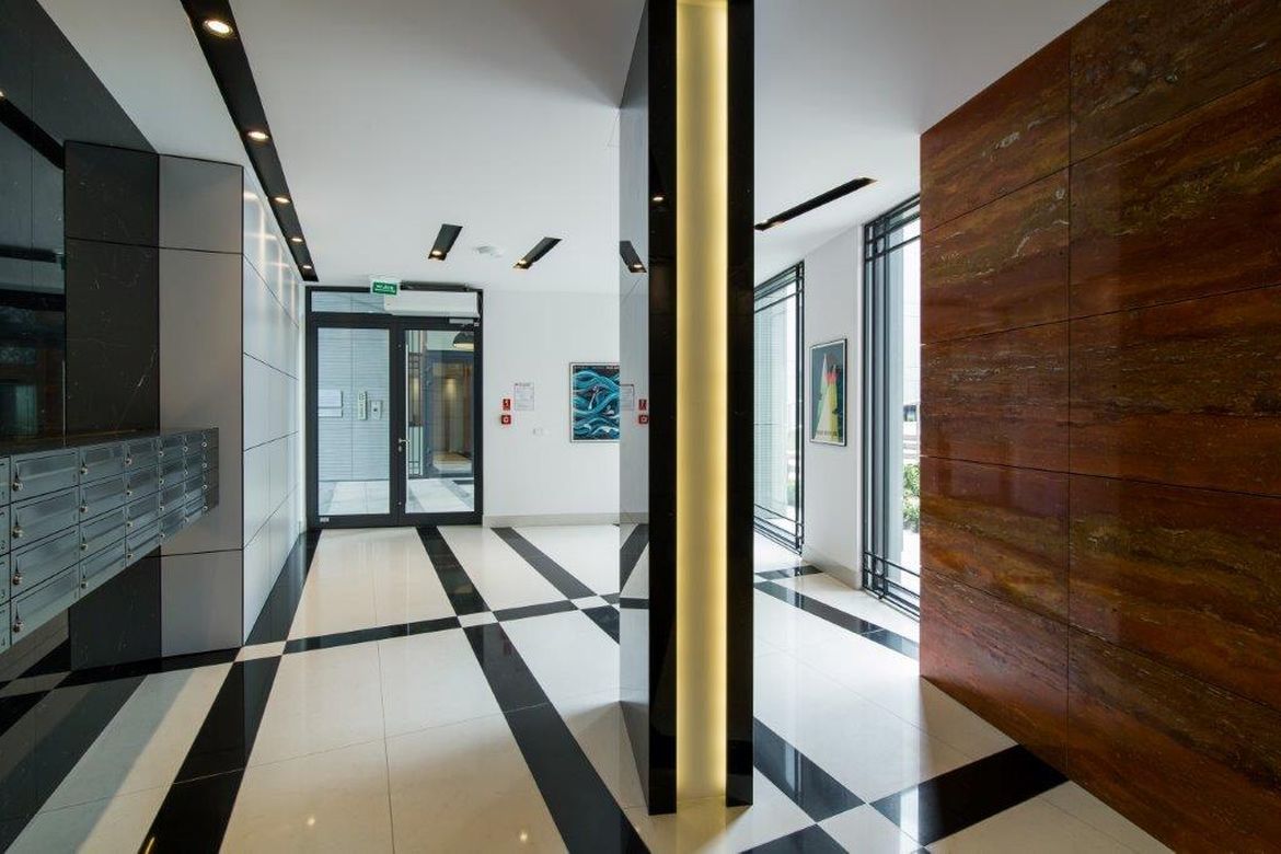 W zakres opracowania wchodziła cała architektura wnętrz związana z częściami wspólnymi, tj. hol wejściowy, recepcja, klatki schodowe, a także zagospodarowanie terenu wokół budynku oraz projekt tarasu na dachu. Wnętrze zostało zaprojektowane z wyjątkową dbałością o detal i dobór materiałów. Odpowiednio docięte płyty z jasnego i ciemnego marmuru tworzą elegancki wzór na posadzce, a wykończenie ścian szarymi płytami i białym tynkiem doskonale kontrastuje z pojawiającym się gdzieniegdzie czerwonym trawertynem o bardzo dekoracyjnym rysunku. W przestronnym holu wejściowym, w części wysokiej na dwie kondygnacje, uwagę przykuwają dwie okazałe lampy Skygarden, które doskonale scalają przestrzeń.
