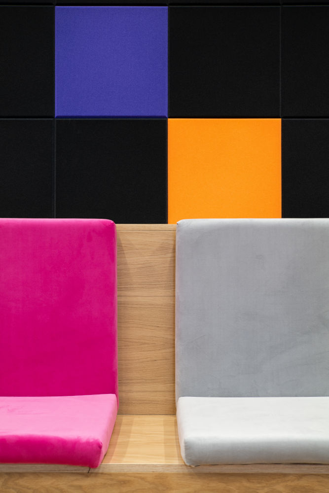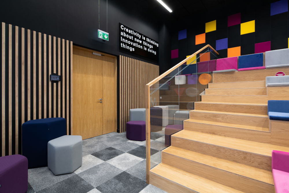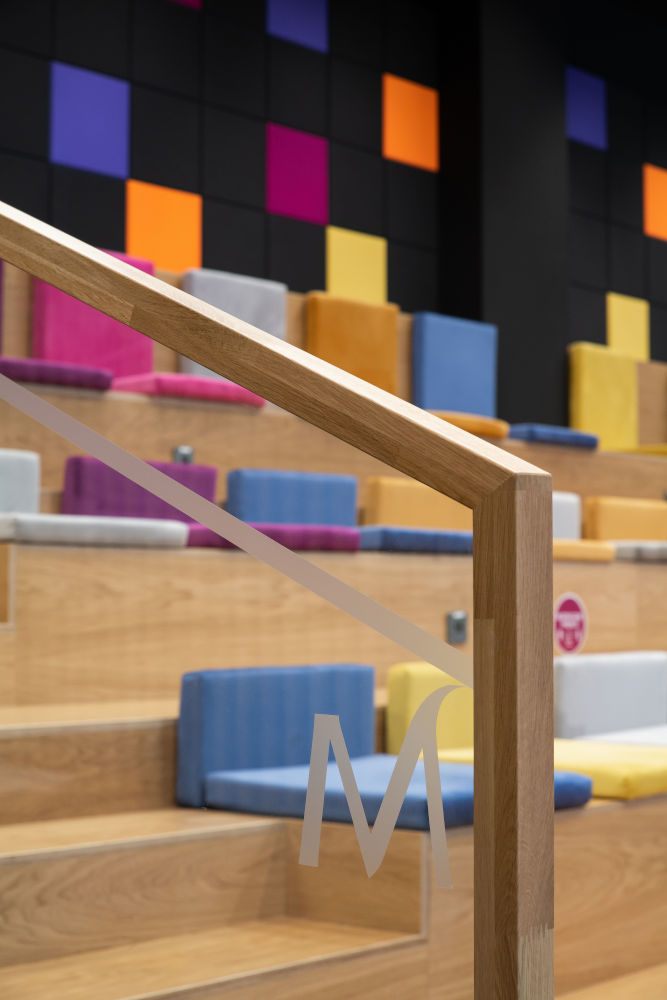 Duża sala o niestandardowej wysokości ponad 4 metrów, pełniła funkcję szkoleniową jednak dopiero pomysł podestu audytoryjnego pozwolił na pełne wykorzystanie jej przestrzeni. Czarny kolor ścian i sufitu nadał nieco kinowego charakteru i stał się świetnym tłem dla intensywnych akcentów kolorystycznych. Usytuowanie ogromnego monitora na tle wysokich okien, daje możliwość oderwania wzroku od prezentowanych treści i spojrzenia w inną przestrzeń.