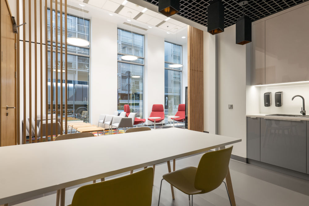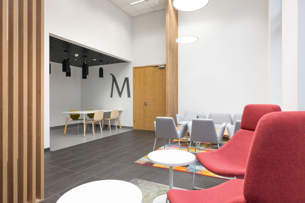 Sala audytoryjna wraz z niewielkim fuaye i aneksem kuchennym stała się inspirującym miejscem kreatywnych spotkań i szkoleń.