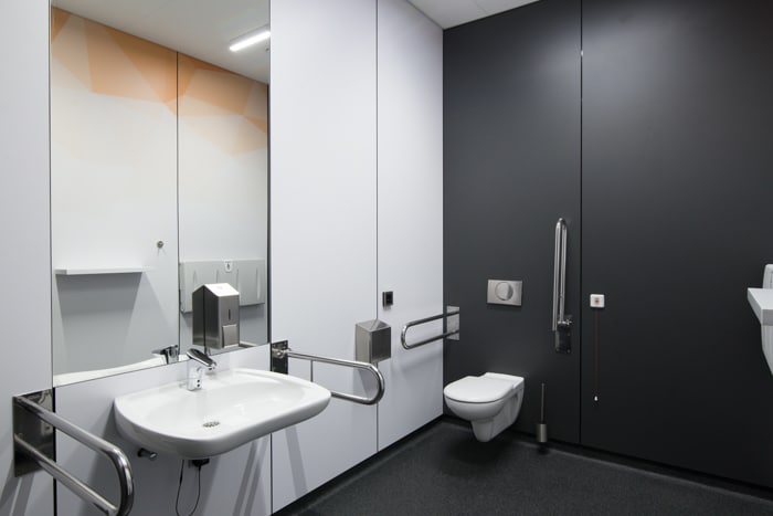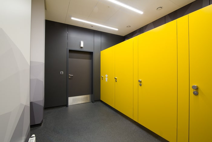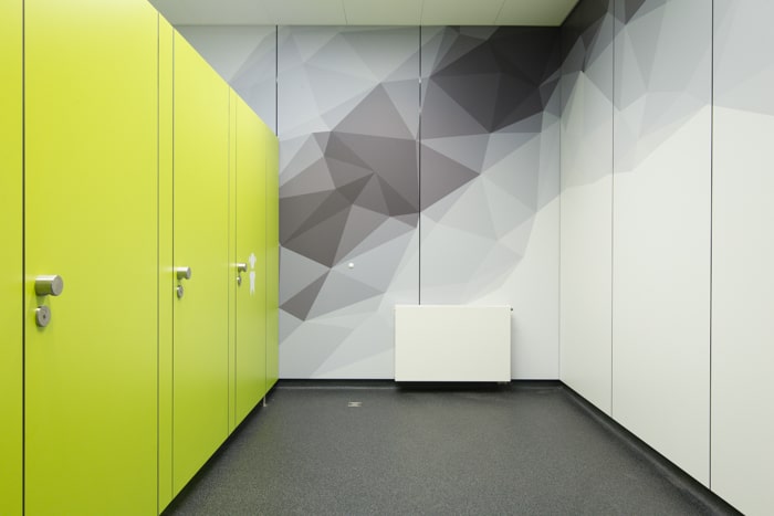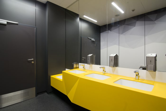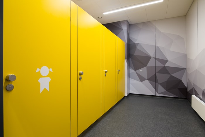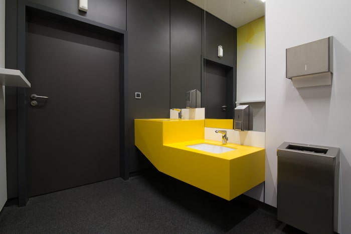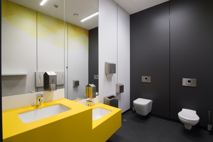 Dotychczasowe łazienki były wykonane prawie w całości w betonie architektonicznym, który jednak szybko stracił walory estetyczne i użytkowe, szara podłoga i szare laminaty dodatkowo potęgowały wrażenie smutnych i brudnych pomieszczeń. Głównym założeniem tego projektu było zaś stworzenie wnętrz znacząco różniących się od pierwotnych, ale zgodnych ze stylistyką i duchem Centrum Kopernika, a także trwałych i odpornych na zniszczenia. I tak powstało wnętrze o kontrastujących, mocnych kolorach, które powstało przy użyciu laminowanych pyt HPL na wszystkich ścianach i drzwiach oraz Corianu na blatach, z umywalkami włącznie. Żeby podkreślić wyjątkowość i oryginalność tych wnętrz, część laminatów jest z nadrukowanym, wybranym do tego projektu wzorem.