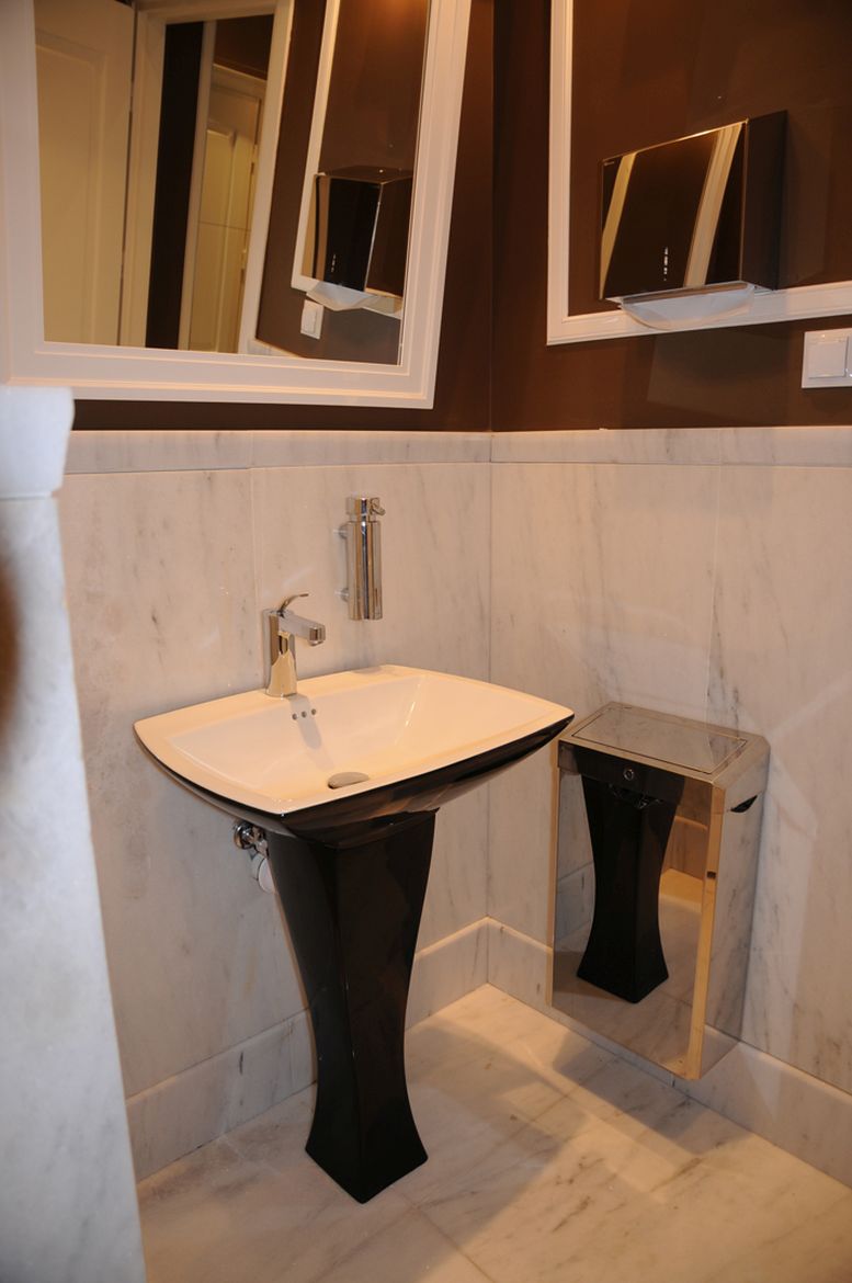 Projekt łazienek w Pałacu Prezydenckim w Warszawie zakładał zmianę aranżacji i odświeżenie dotychczasowych pomieszczeń sanitarnych. Pomieszczenia zaopatrzone zostały w funkcjonalne i nowoczesne wyposażenie sanitarne. Dodatkowo dobrane zostały wysokiej jakości materiały wykończeniowe. Posadzka i ściany z różnokolorowego marmuru oraz płytek ceramicznych w klasyczne wzory w połączeniu z delikatnym detalem w formie gzymsów naściennych tworzy niepowtarzalne, eleganckie wnętrze, nawiązujące do charakteru miejsca.