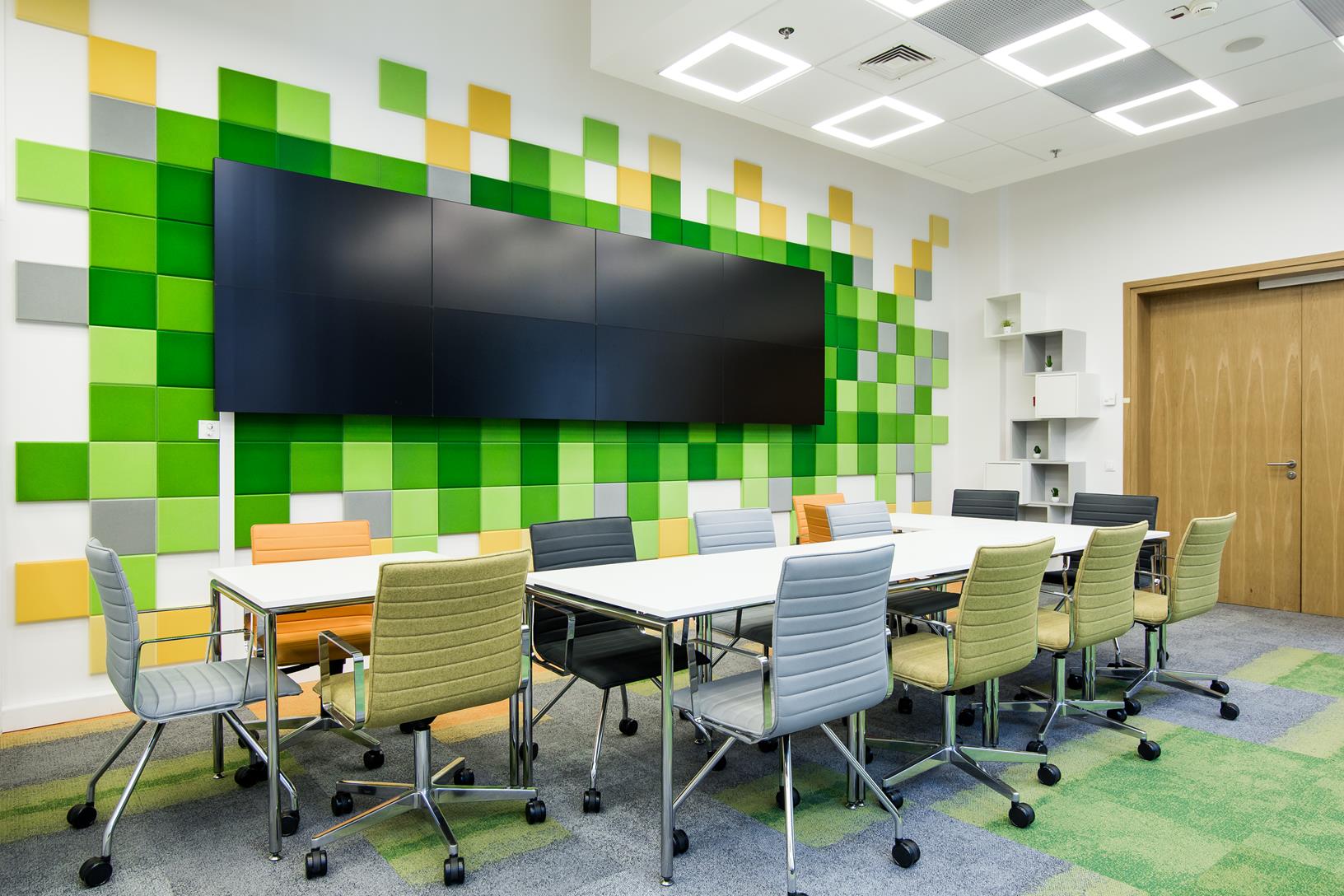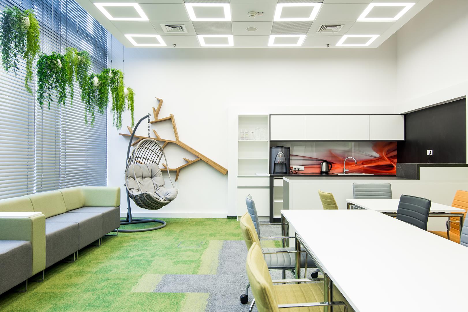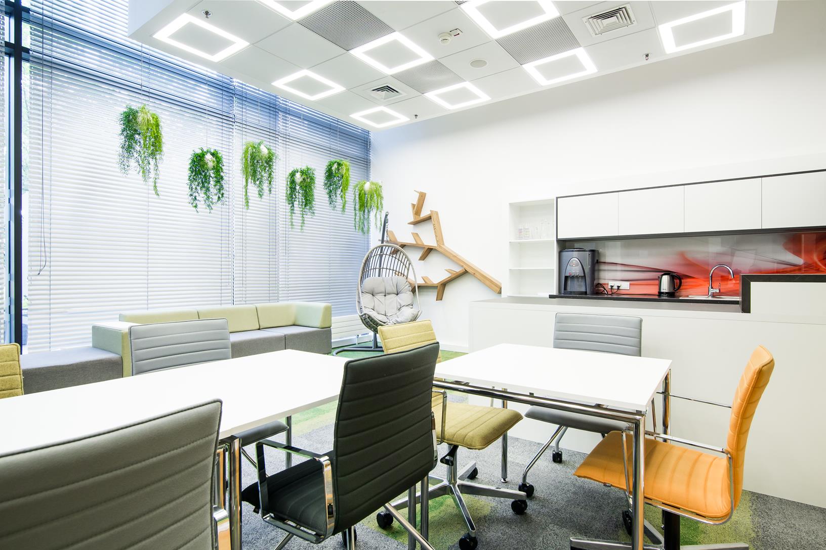 Mindshare’s training space was created on the site of a large conference room. This change is a sign of the times where traditional meetings at the big table are a thing of the past. The friendly and informal atmosphere of the interior design and great arrangement options allow you to organize meetings in various configurations. The wall lining with monitors and Fluffo panels improved the interior acoustics and slightly softened the raw appearance of the room. Soft and comfortable seats by the glass facade, encourage you to reflect under the hanging garlands of plants introducing an informal atmosphere into the interior.