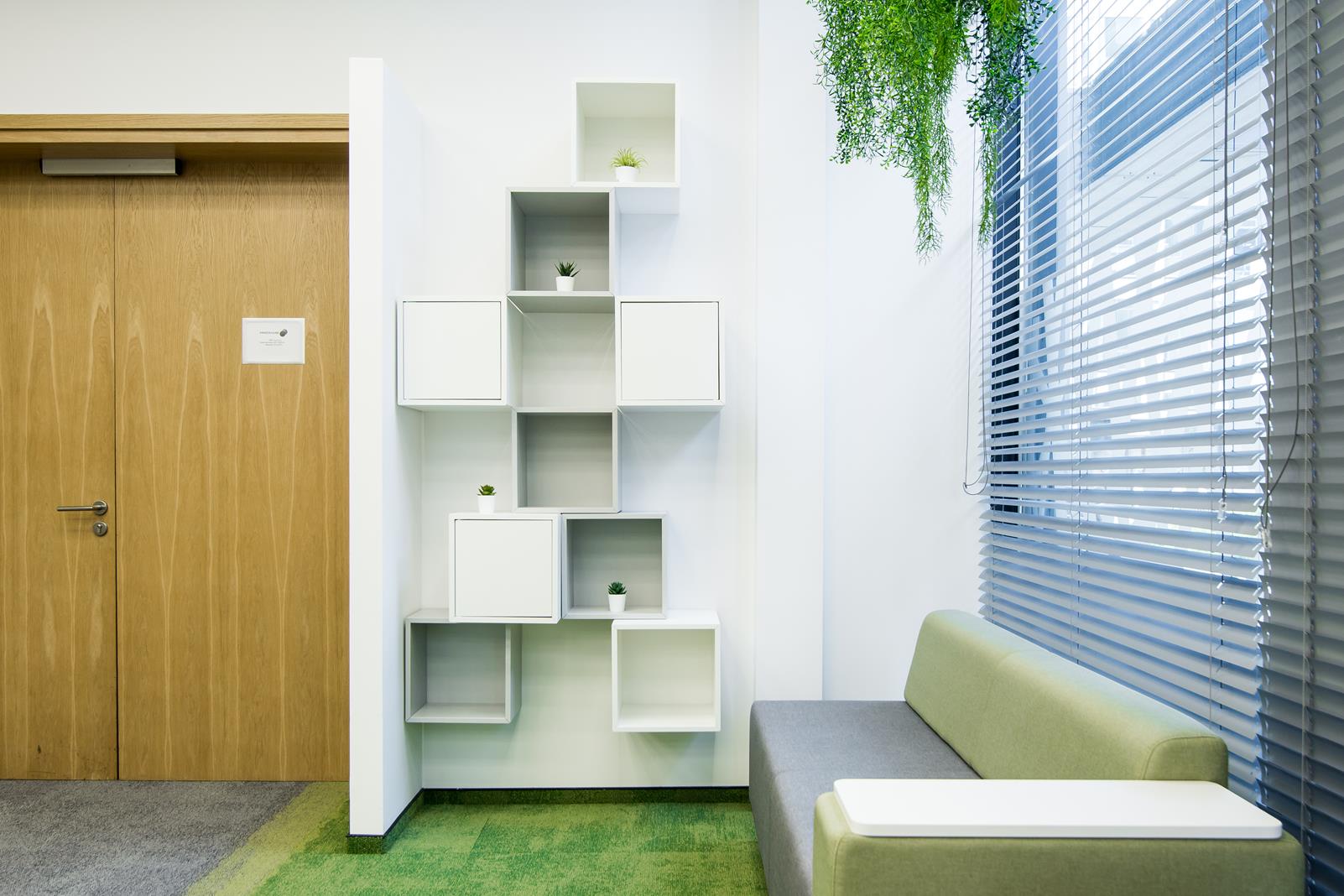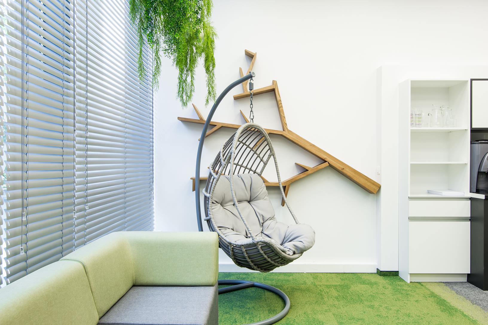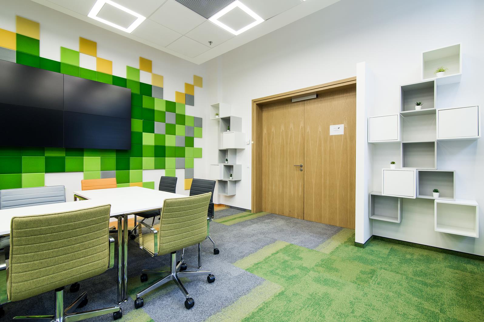Mindshare’s training space was created on the site of a large conference room. This change is a sign of the times where traditional meetings at the big table are a thing of the past. The friendly and informal atmosphere of the interior design and great arrangement options allow you to organize meetings in various configurations. The wall lining with monitors and Fluffo panels improved the interior acoustics and slightly softened the raw appearance of the room. Soft and comfortable seats by the glass facade, encourage you to reflect under the hanging garlands of plants introducing an informal atmosphere into the interior.