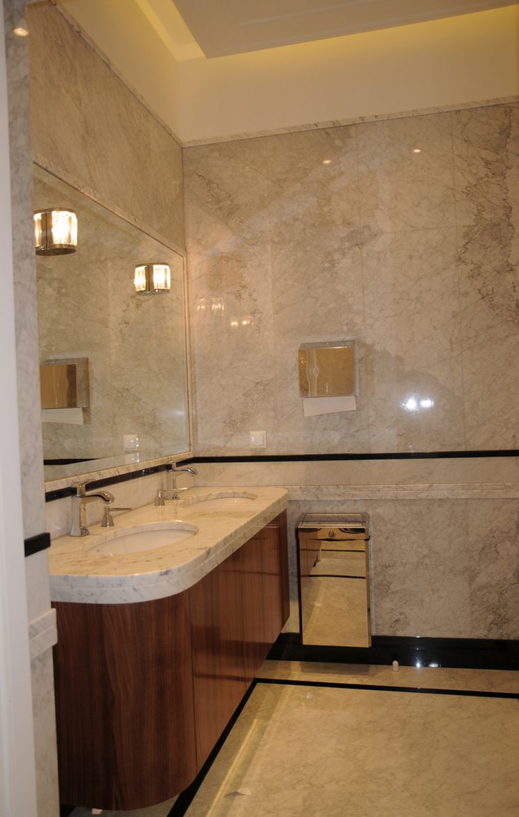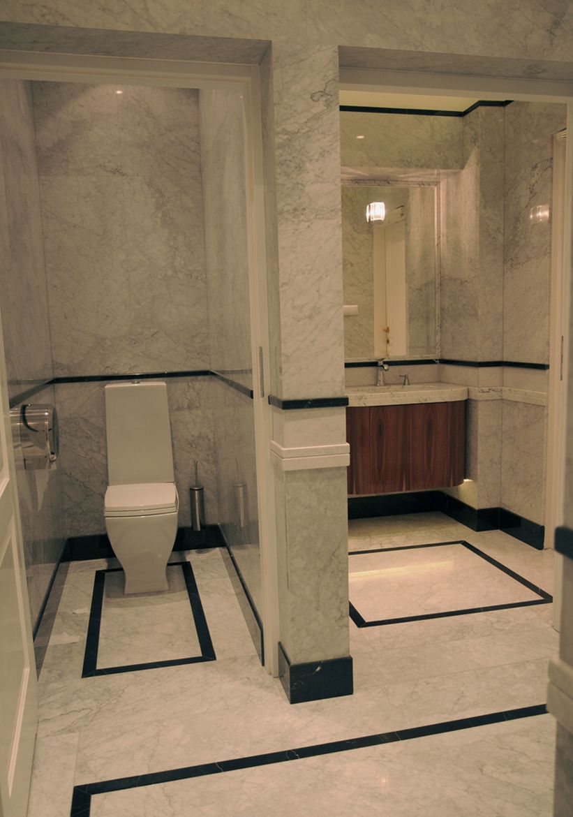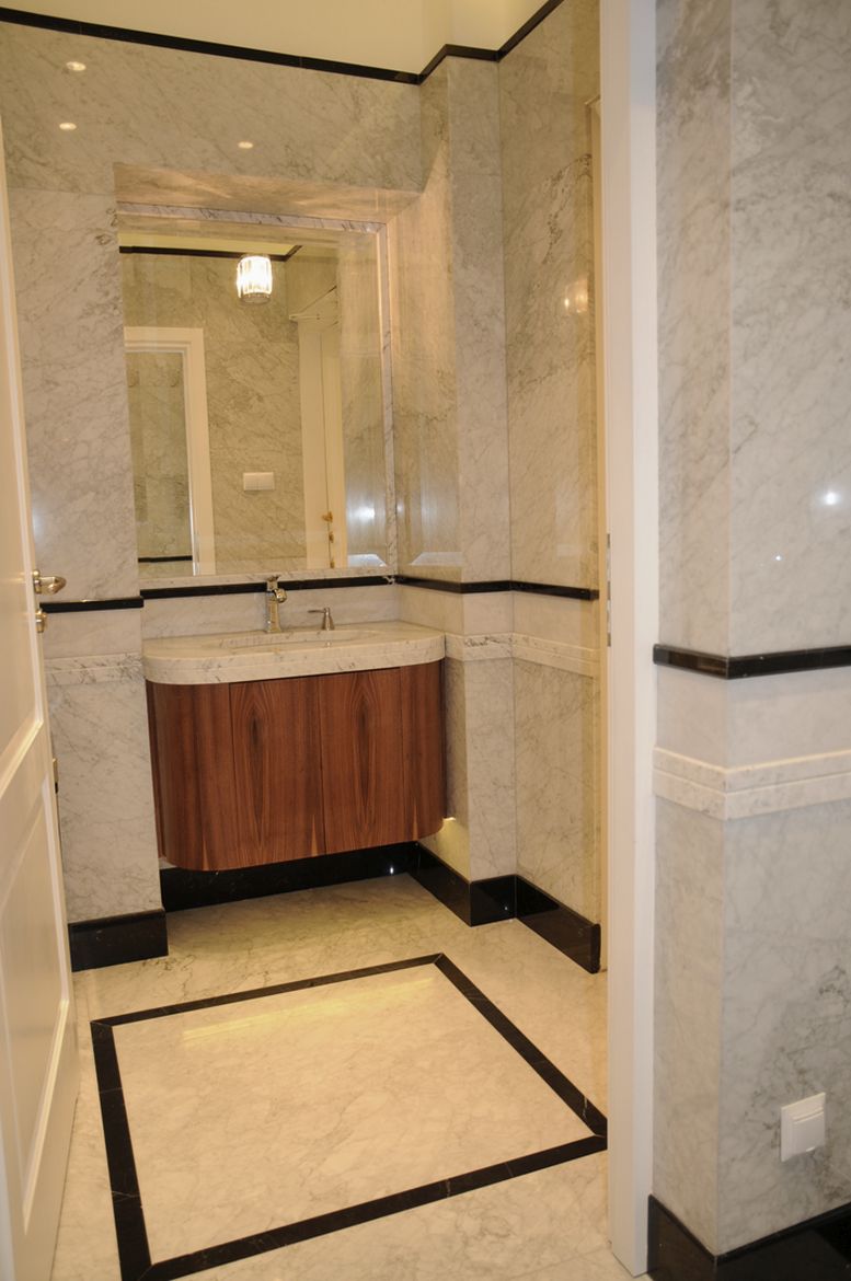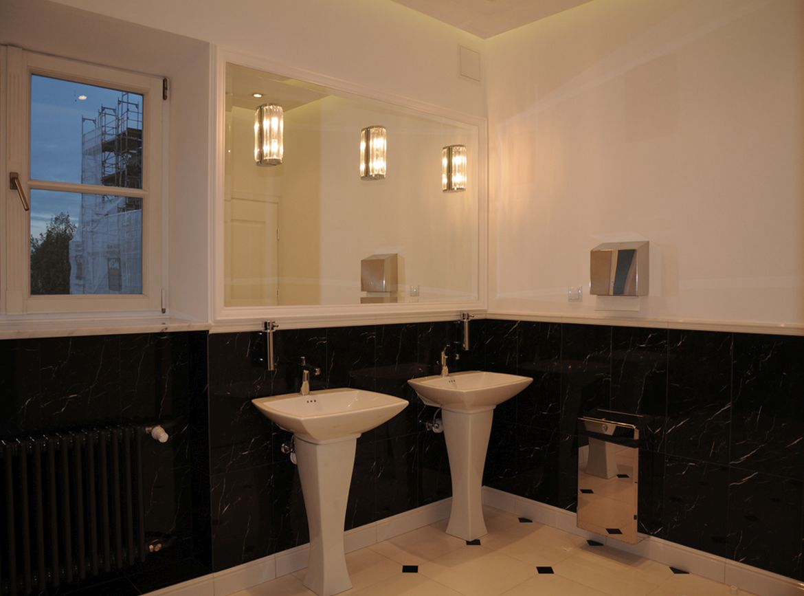The bathroom design at the Presidential Palace in Warsaw assumed a change in the arrangement and refresh the existing sanitary rooms. The rooms were equipped with functional and modern sanitary equipment. In addition, high-quality finishing materials were selected. The floor and walls made of colorful marble and ceramic tiles with classic patterns combined with a delicate detail in the form of wall cornices creates a unique, elegant interior, referring to the character of the place.