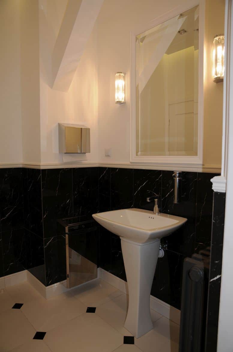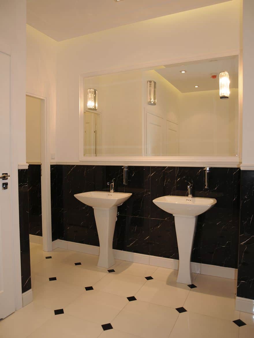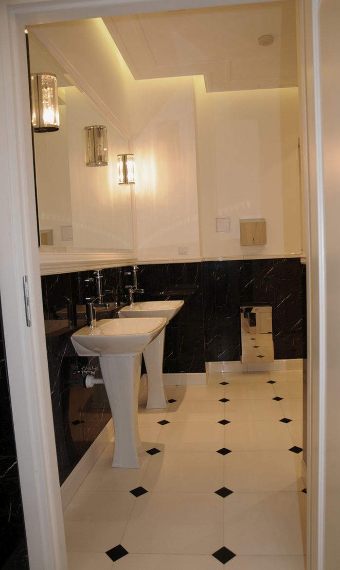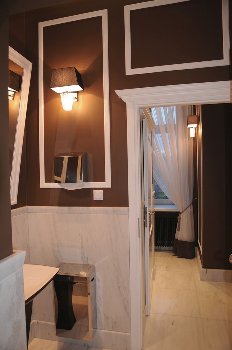 The bathroom design at the Presidential Palace in Warsaw assumed a change in the arrangement and refresh the existing sanitary rooms. The rooms were equipped with functional and modern sanitary equipment. In addition, high-quality finishing materials were selected. The floor and walls made of colorful marble and ceramic tiles with classic patterns combined with a delicate detail in the form of wall cornices creates a unique, elegant interior, referring to the character of the place.